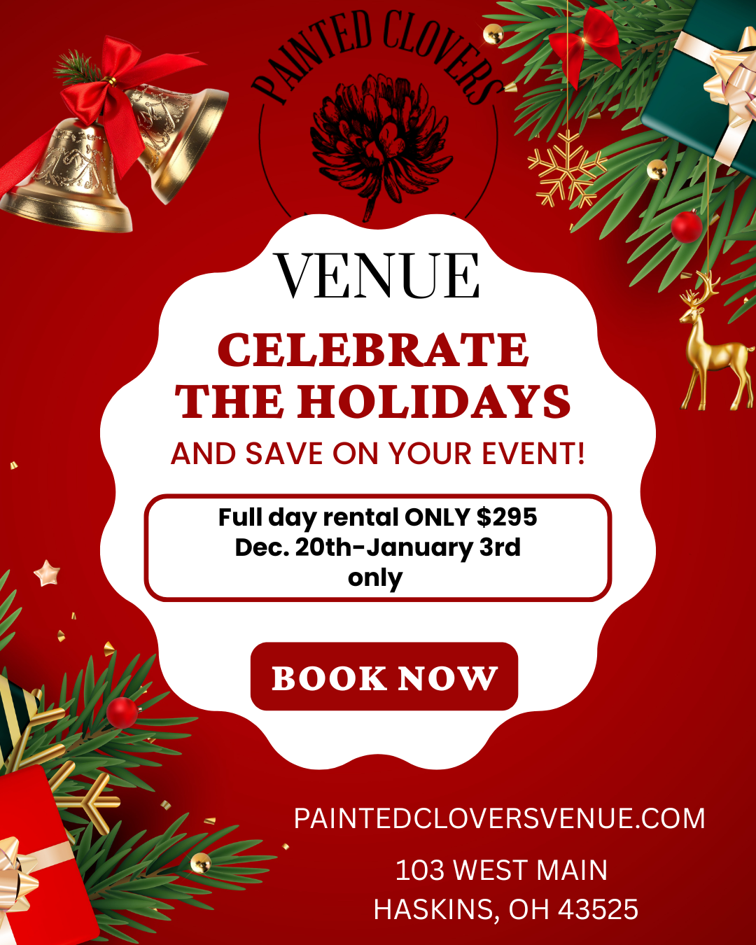 Welcome to The Venue by Painted Clovers! Our 1800 sq. ft. micro venue is the perfect backdrop to any occasion. With modern updates to this historical landmark your guests will love our open concept venue. From the cream painted brick and the dark ceiling and floors to the industrial lamps suspended from the ceiling with bistro lights strung across the entire space embellished with faux greenery. Simple, elegant, timeless and located in a convenient location of Haskins and close to Maumee, Waterville, Bowling Green, Perrysburg, Whitehouse, Toledo and surrounding areas.